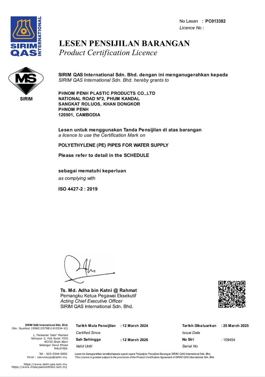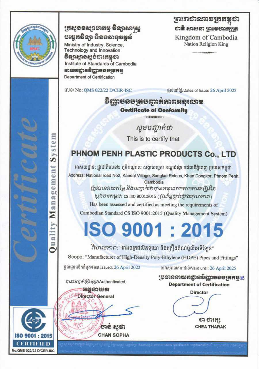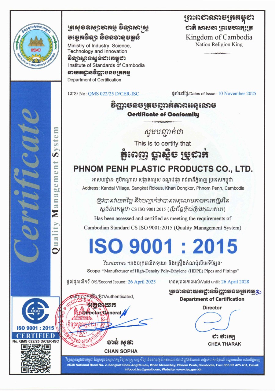 Phnom Penh Plastic Products Co., Ltd is the First and leading factory of HDPE (High Density Polyethylene) pipe since 2015 in Cambodia. Our vision is to manufacture high quality HDPE pipe for water pipelines, electrical conduits, telecommunication pipelines, underground natural gas pipelines, sewage pipe, butt fusion fittings, compression fittings, pipe fittings, pipe accessories and pipe for pumping sand. Our products are certified by ISO 9001:2015 and ISO 4427-2:2019 under rigorous process controls to ensure that each product meets quality requirements and has lifespan over 50 years.