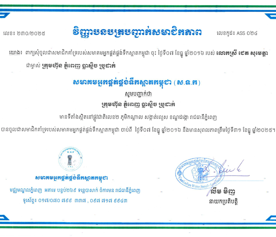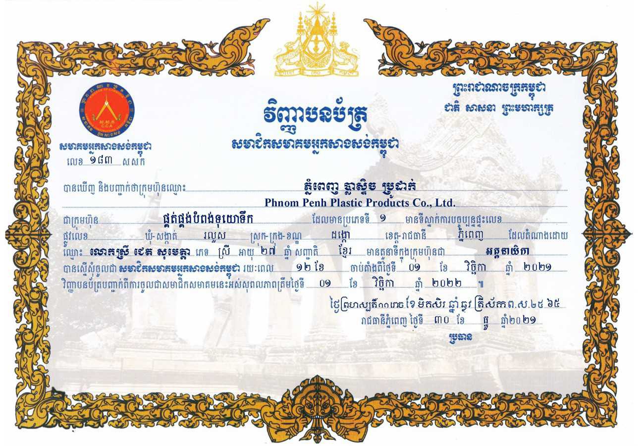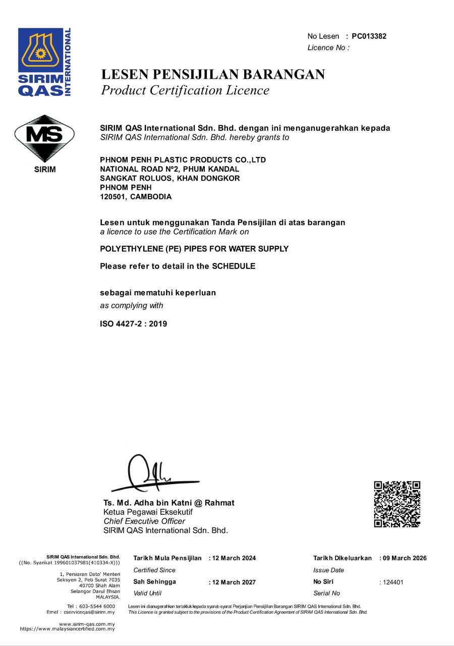 Phnom Penh Plastic Products Co., Ltd is the First and leading factory of HDPE (High Density Polyethylene) pipe since 2015 in Cambodia. Our vision is to manufacture high quality HDPE pipe for water pipelines, electrical conduits, telecommunication pipelines, underground natural gas pipelines, sewage pipe, butt fusion fittings, compression fittings, pipe fittings, pipe accessories and pipe for pumping sand. Our products are certified by ISO 9001:2015 and ISO 4427-2:2019 under rigorous process controls to ensure that each product meets quality requirements and has lifespan over 50 years.